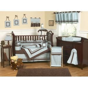 Designer Blue and Brown Hotel Modern Baby Boy Bedding 9pc Crib Set Features