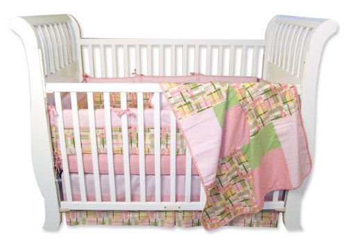 Nantucket is a charming seaside summer house look for your nursery. Madras plaid is offset with a complementary floral scatter print and crisp ticking stripes. Tonal pinks and greens are accented with a soft butter yellow. Set includes: 4 separate bumpers to fit any crib, patched coverlet that is a useful crib blanket, floral print 100% cotton percale sheet with deluxe 10" pocket, 15" long box pleat skirt.